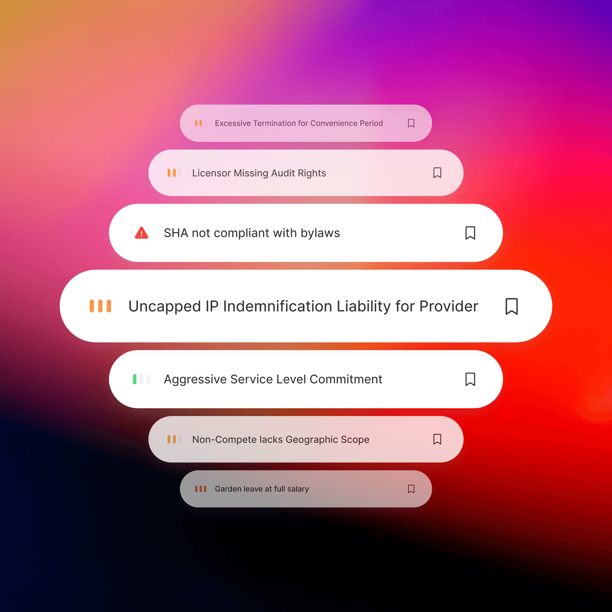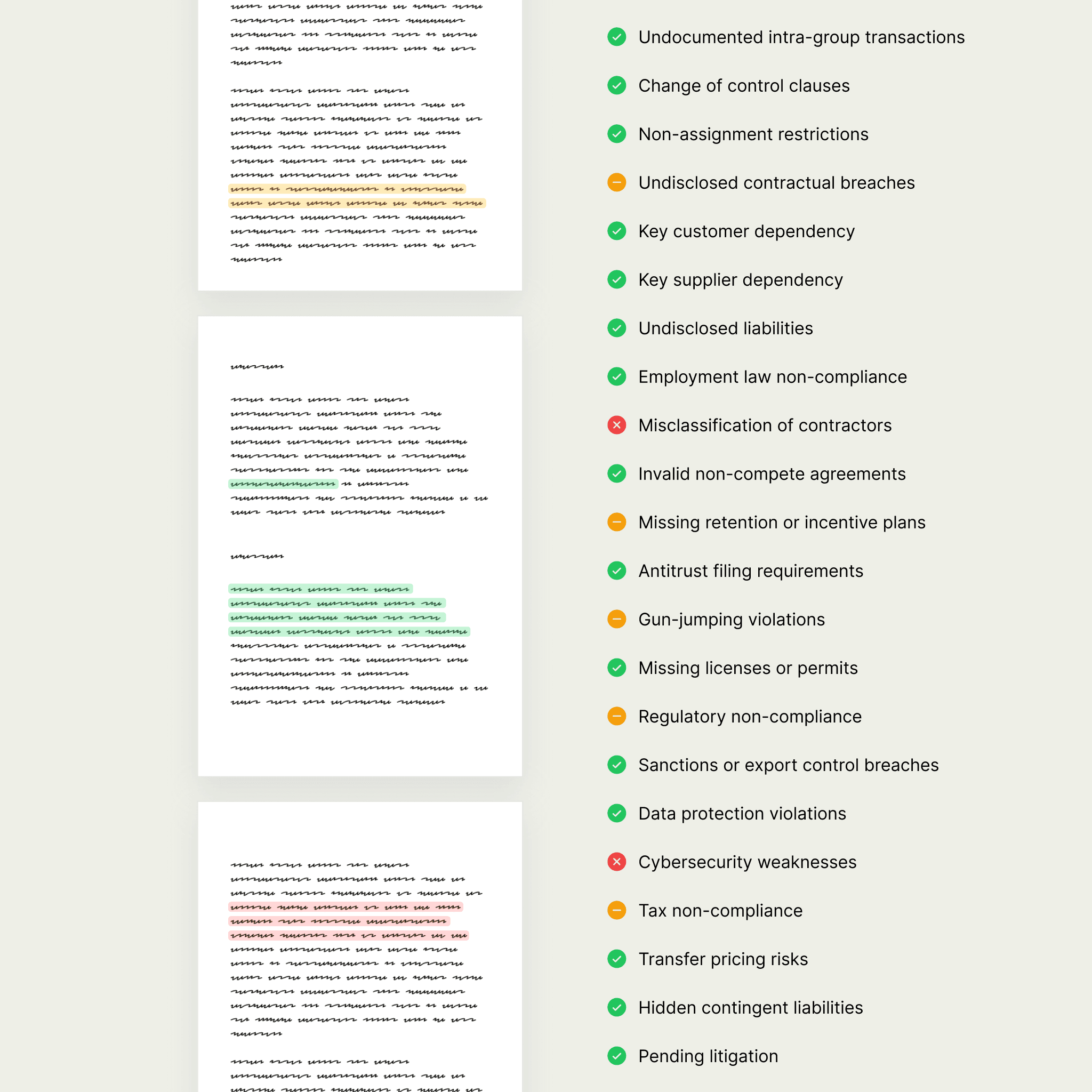 Automatically scan the complete data room for legal risks such as change of control clauses, unenforceable terms, compliance gaps and unusual indemnities.