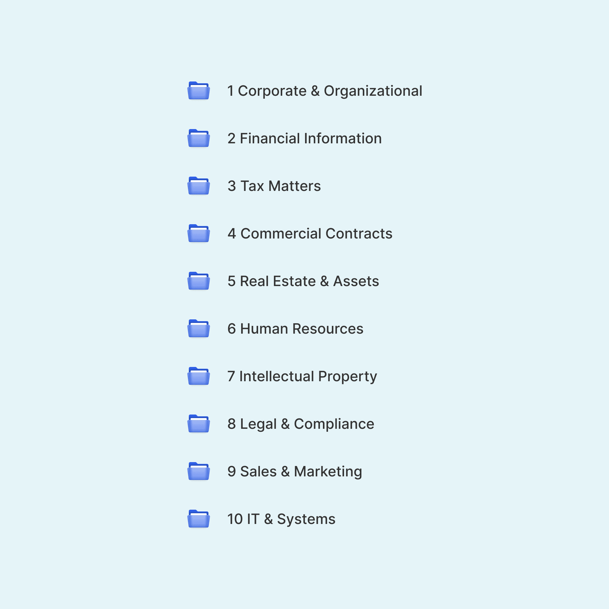 Bring order to unstructured data rooms by automatically organising every document. Categorise files according to your information request (DDQ) and detect missing items and duplicates. Work from an organised data room without manual sorting.