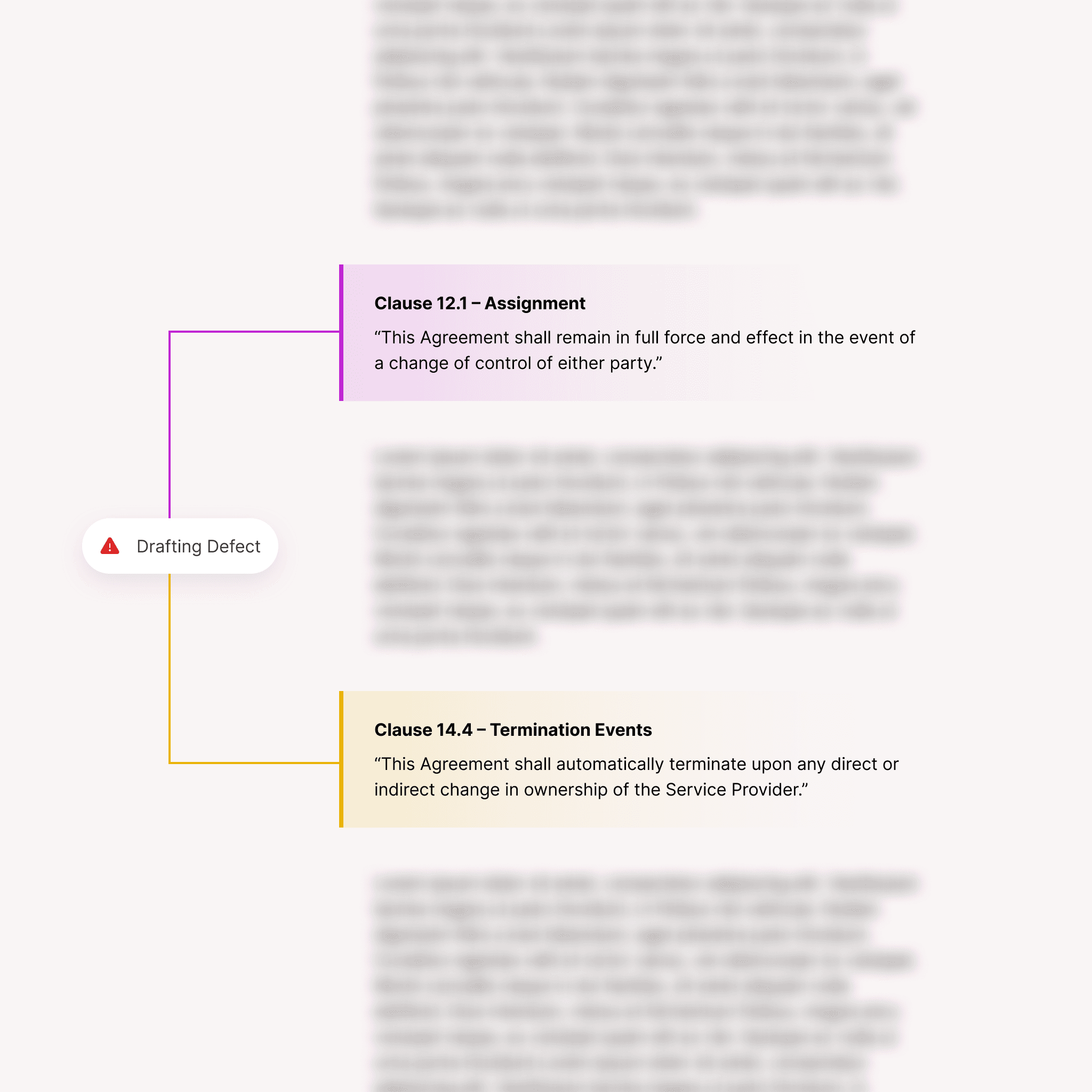 Jurimesh identifies transferability issues, assignment restrictions, change-of-control clauses, indemnities, limitations of liability, payment terms, and other contractual exposures. You get a clear view of contractual obligations that impact structure, pricing, or integration.